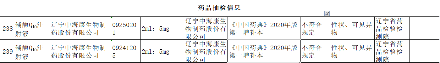 根據(jù)公告,該2批次不合格輔酶Q10注射液,標(biāo)示生產(chǎn)企業(yè)為遼寧中海康生物制藥股份有限公司,生產(chǎn)批號(hào)為09250201、09241205,規(guī)格為2ml:5mg,不符合項(xiàng)目為性狀、可見(jiàn)異物。